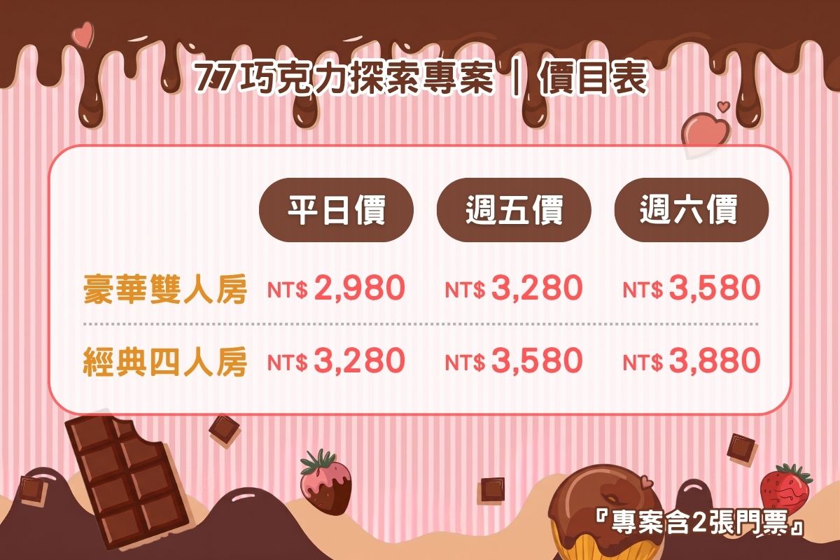※本專案僅包含2張成人票,需購買其餘門票請於77巧克力共和國現場加購。